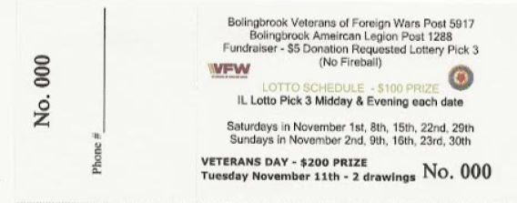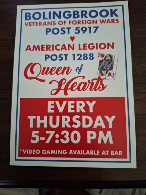 Every Thursday starting at 5 PM members from Bolingbrook VFW Post 5917 and American Legion Post 1288 conduct raffles and a "Queen Of Hearts" drawing where you could win Big $$$ Money $$$. The prize distribution depends or the amount collected in a progressive pot for the Queen, however concellation prizes are also awarded to the Lucky Person such as car washes, two drinks, tickets to next weeks drawing, and cash, there are no losers. We also sell pull tabs for on the spot cash winners. Come out and help us for this worhty cause, as all proceeds are used in our Veteran's Relief Funds.
